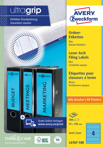 Etykieta na segregator Avery L4767-100, 192 x 61 niebieskie, szerokie, 400 etyki