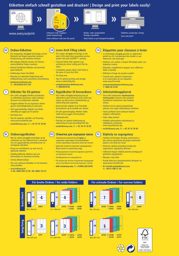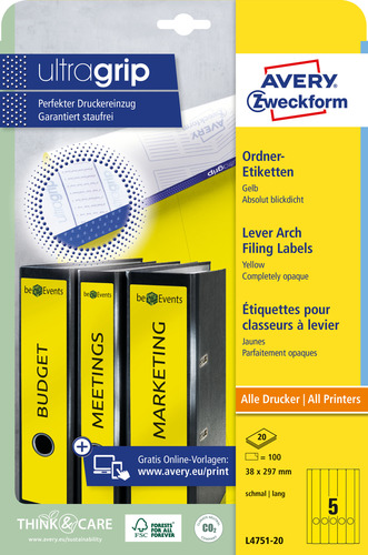 Etykiety na segregator Avery L4751-20, 38 x 297mm żółte, wąskie, długie, 100 szt.