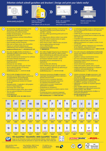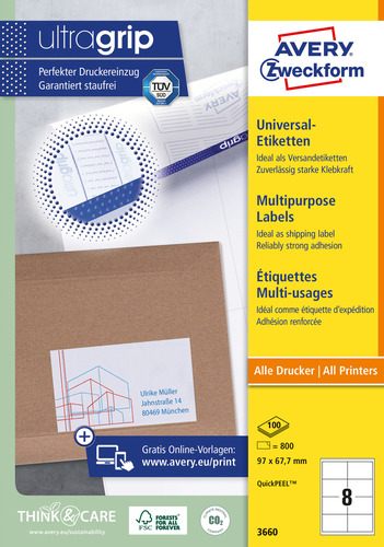 Etykiet uniwersalnych samoprzylepnych o gęstej bieli i mocnym klejem od Avery Zweckform można używać na wszystkich typach drukarek i kopiarek. Posiadają certyfikat TÜV gwarantujący bezpieczeństwo zadruku bez zacięć. Etykiety uniwersalne mogą być wykorzystane do wszechstronnych zastosowań, jako rozwiązanie dla wielu potrzeb związanych z oznaczaniem